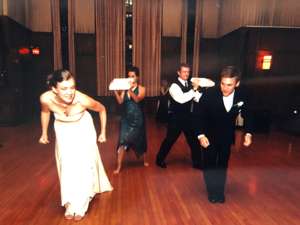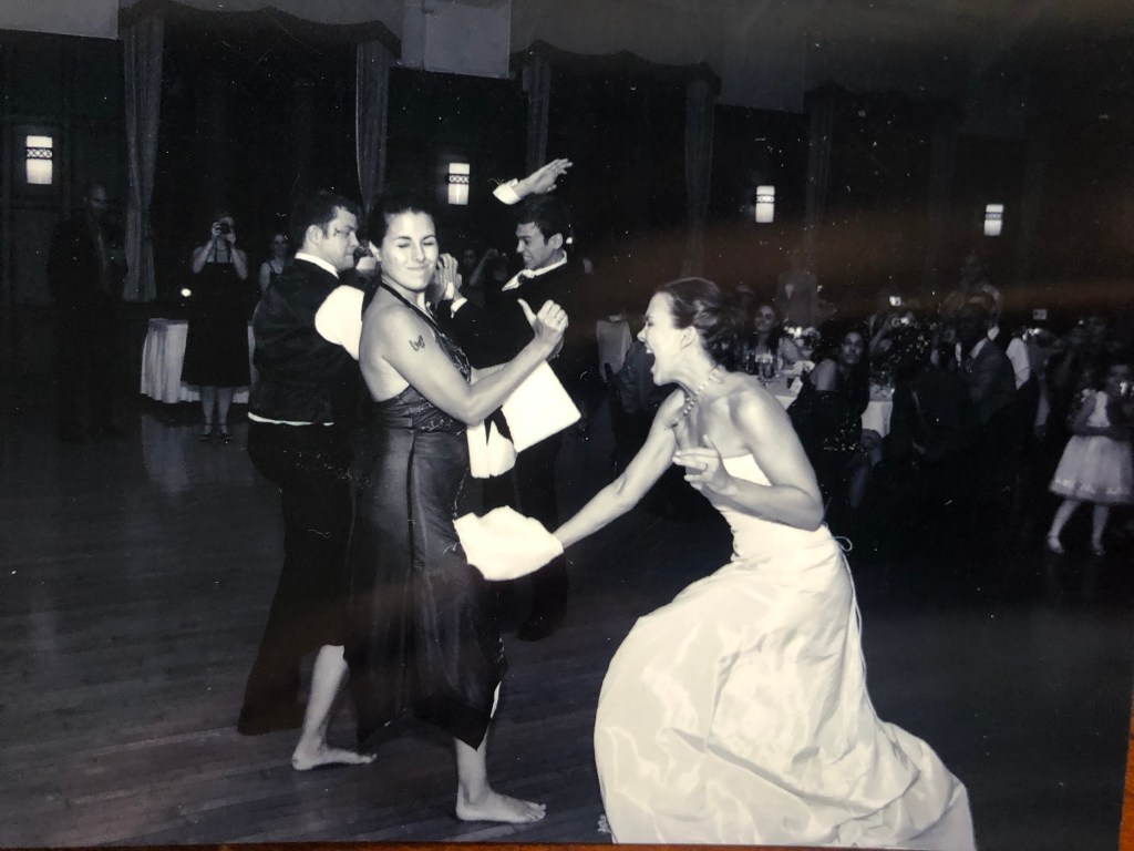 So when it came time to plan our wedding, I realized I could incorporate our love of chopping things in half with our hands with the cake cutting ceremony. We would karate chop our wedding cake. My brother made us styrofoam dummy cakes covered in fondant and frosting. He and his wife, who, of course, both also had martial arts experience, held the cakes for us. It looked like this: