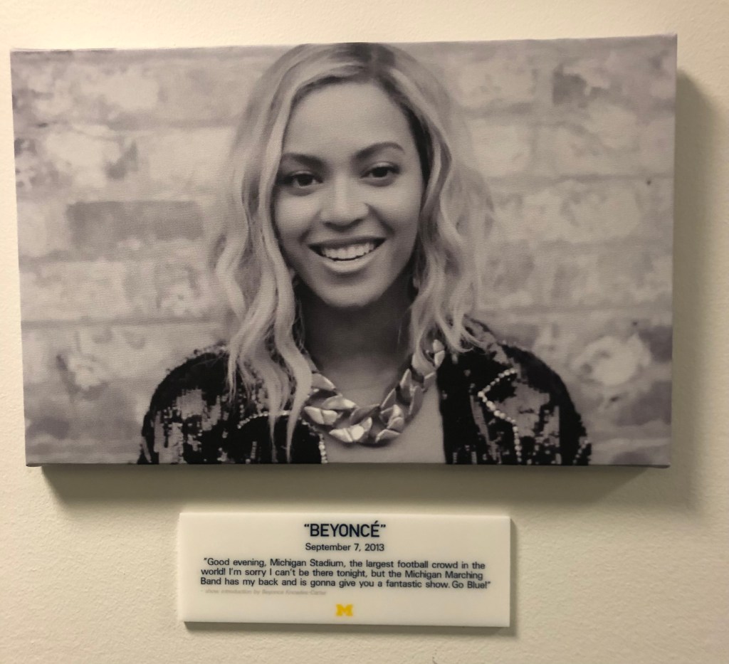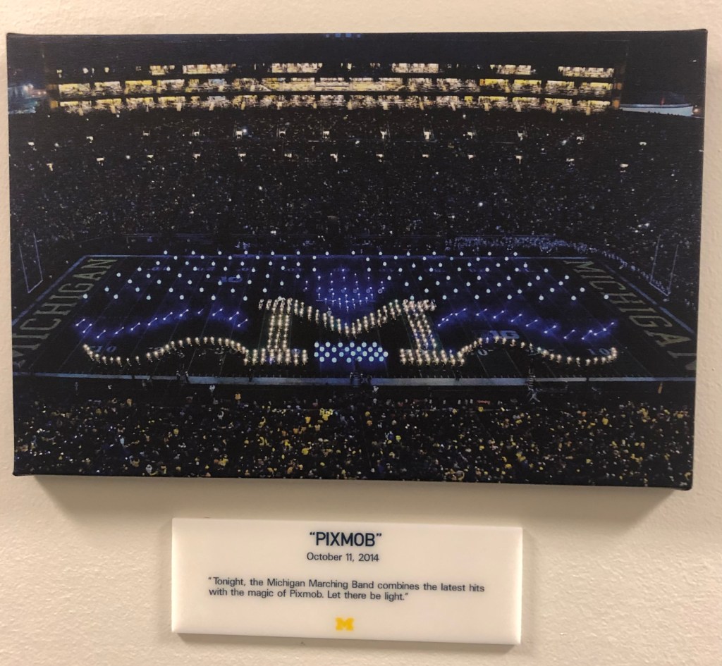 So I’m in Revelli Hall, the band hall for the Michigan Marching Band, or the MMB. It is the first time I have been here in at least 18 years. I am FILLED TO THE BRIM with nostalgia. I’m looking into the room where they keep the stuffed wolverine, I’m greeting other alumni with nods and smiles, I’m walking down the hall with photos highlighting the greatest MMB moments over the years.