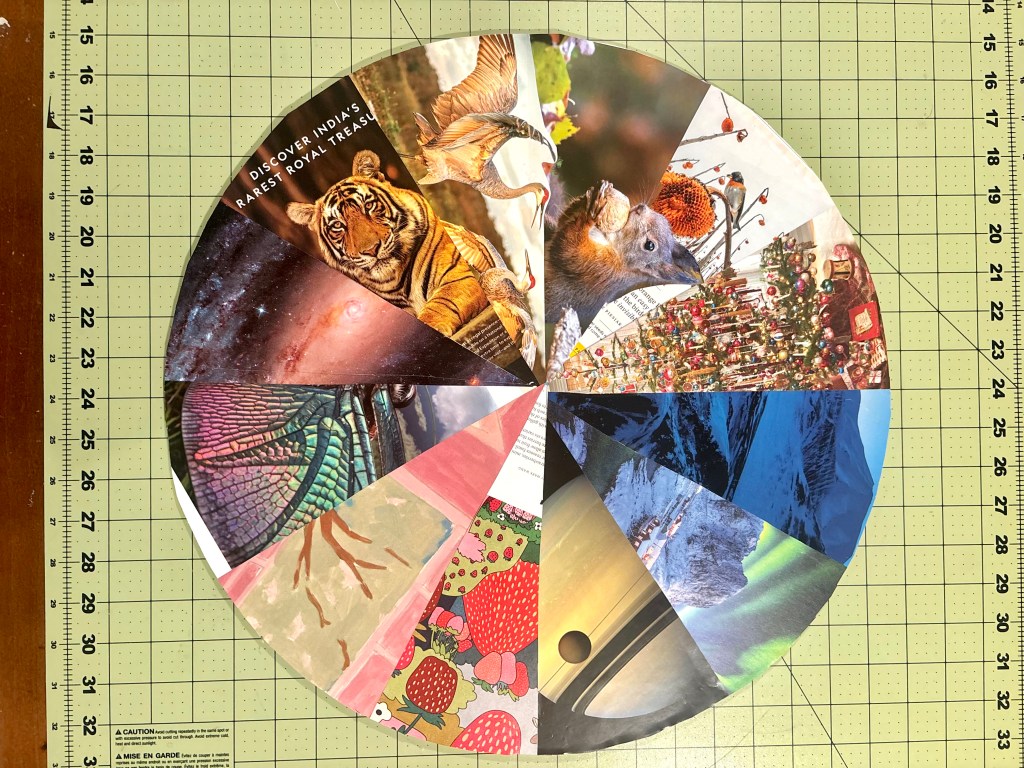 I wanted my calendar to be similar to those wheels, but to list the months, and perhaps include other holidays and occasions that were meaningful to me. I also wanted to be able to mount my calendar on the wall by putting a nail in the center, so I could then turn the calendar itself as the year progressed. The calendar wasn’t meant to list appointments or even individual days. It’s more a calendar of the seasons to keep me oriented within the year. I often feel like I’m operating a little behind schedule, and things sneak up on me. The circular calendar would let me see the whole year at once, so that I could know where I was and what was coming up.