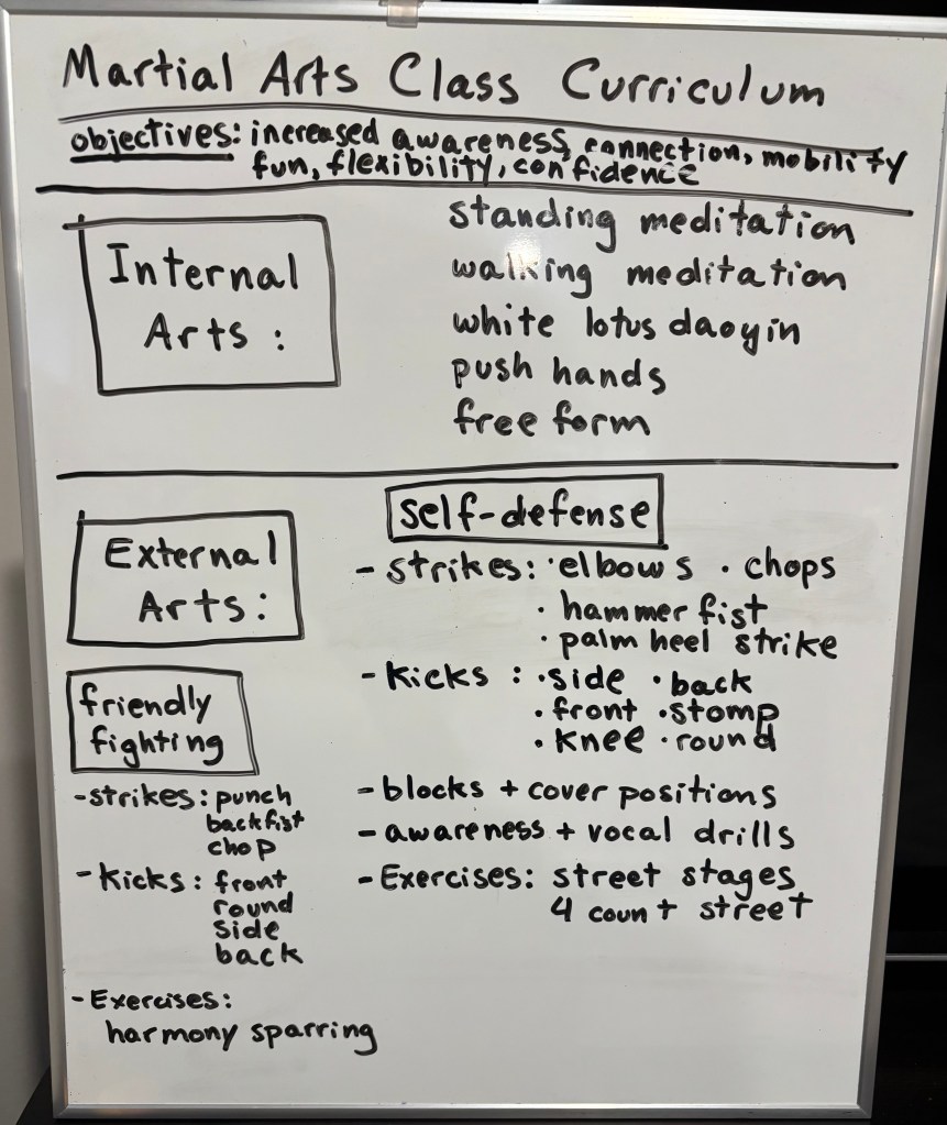 Her question shocked and delighted me–she had been in my class for months and after all that time she was asking me what the class actually was. She asked for words that described what we were doing. I stammered for an answer. “Umm, well, it’s called Women’s+ Martial Arts, and we’re learning martial arts, but not in a traditional sense. We’re training some internal arts, but also some external. And some self-defense… I think you should tell your friend it’s a martial arts movement class.” I felt pretty good about my answer, but didn’t feel like it was entirely complete. I told her after class that I appreciated her question and would continue to think on it. I told her I would also start writing out our curriculum so we could all get a clearer sense of what we were learning.