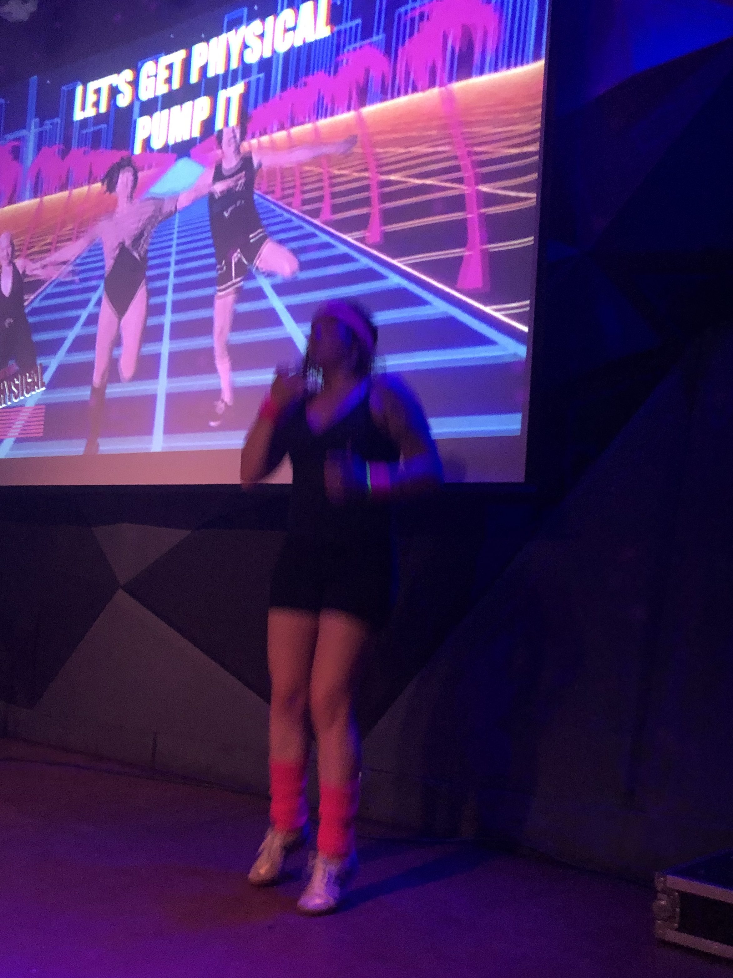 We entered the club soon after 7pm, and soon we were all aerobicizing together in our silly and wonderful outfits. Our group of ten or so made up the bulk of the crowd, and we brought an ebullient spirit. We dutifully followed the moves of our instructor, who made it known that she was not only unqualified to lead our class, she was also completely untrained. She sipped her aperol spritz between exercise moves.