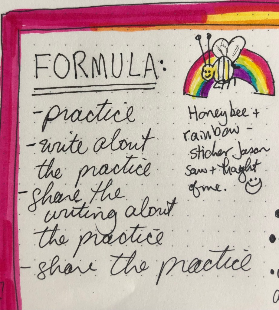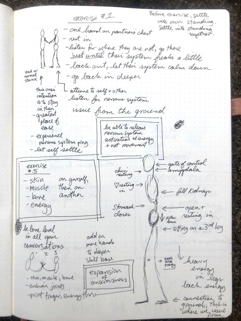 A lot of the work we do is emotional–noticing held beliefs and how they manifest as patterns of tension in our bodies, minds, and spirits. But this time in Canada, while we did touch on emotional holding, we practiced more of the physical building blocks of good standing and push hands practice. I kept great notes about all of these things–here is a page from my book:
