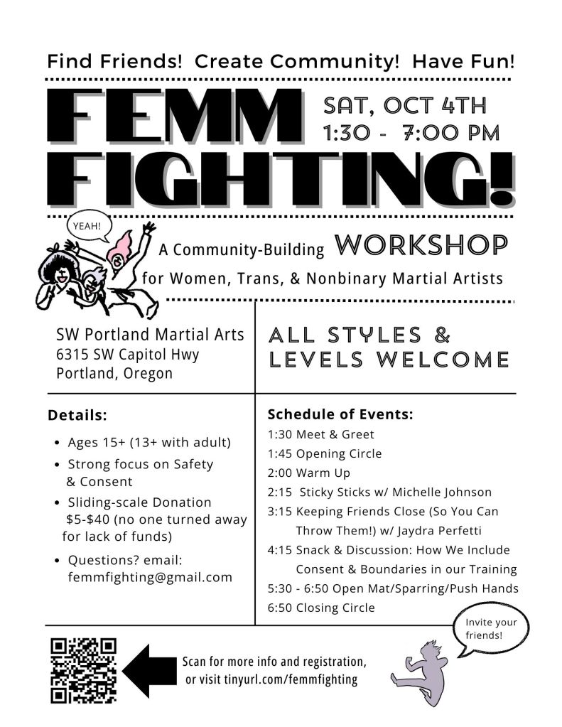 Hi Fighting Friends! Our next Femm Fighting Workshop will be in Portland, Oregon on Saturday, October 4th, 2025. You can register here.